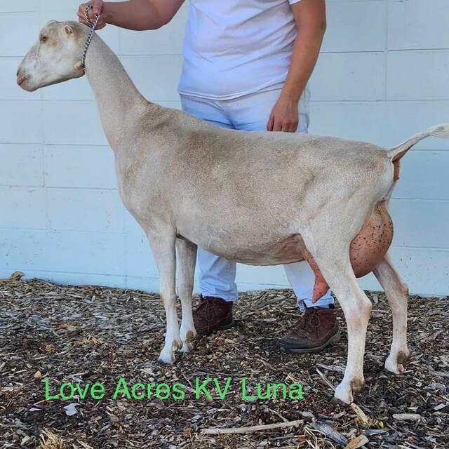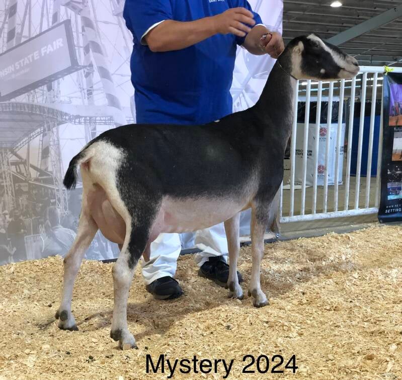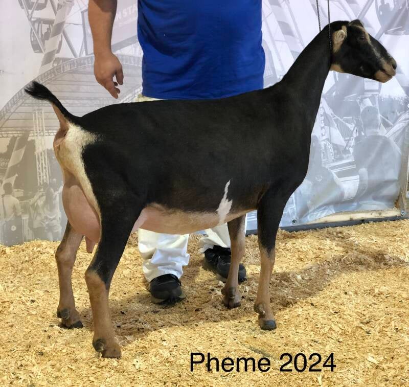 I decided to keep Priapus this spring after losing his sire suddenly in the fall of 2023. I love his dame Pheme's (pictured) level wide top line. With a wide correct muzzle, and very correct mammary system. His sires dam is one of my top production does and was #4 in milk on the 2023 Top 10 Breed leader list.